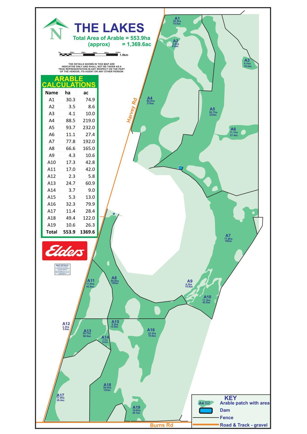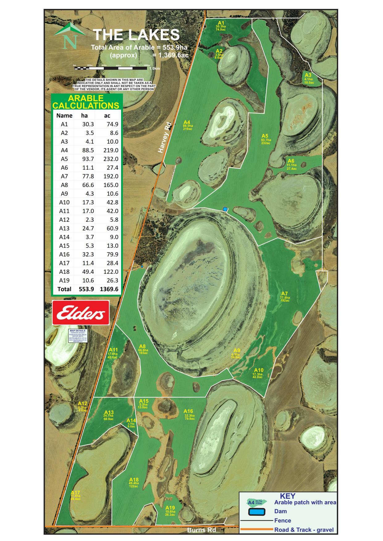 KEY FEATURES * 1,377.2412ha (3,403.23ac) Total Land Area * 553.9ha (1,369.6ac) Cropable Land Area * $1,242/crop acre. * 2 Titles * 10 km of gravel road frontage. * 20km to Lake Grace CBH delivery site. * 2 Dams one with roaded catchment, one turkey nest dam filled from freshwater hole via pump. * Scheme water. * 8 paddocks. * Very good / good boundary fencing with, very good to good internal fencing.